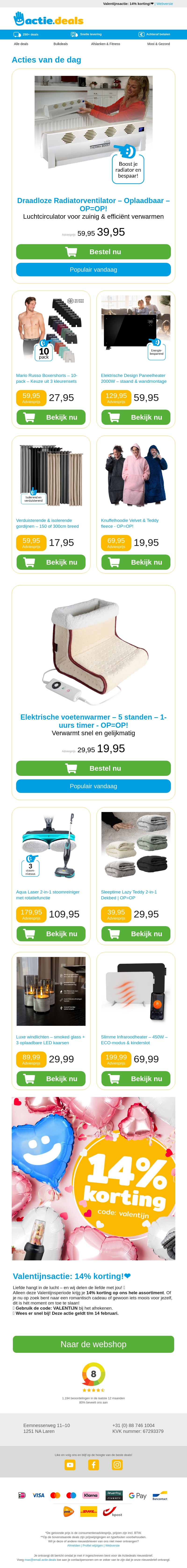 Ontdek de nieuwste aanbiedingen met Mario Russo boxers in een 10-pack, een efficiënte draadloze radiatorventilator, stijlvolle design paneelheaters en isolerende gordijnen. Vergeet de knuffelhoodie velvet niet, perfect voor koude dagen. Profiteer nu van scherpe prijzen en exclusieve Valentijnskorting!