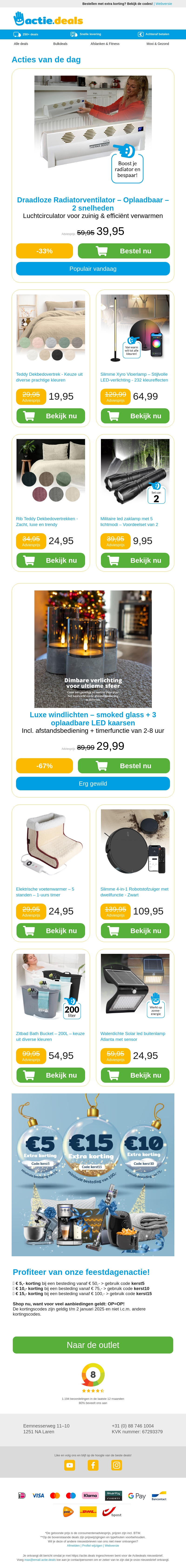 Grijp nu je kans met de nieuwste aanbiedingen! Ontdek draadloze radiatorventilatoren voor efficiΓ«nte verwarming, luxe teddy dekbedovertrekken voor extra comfort, slimme vloerlampen voor een modern huis en krachtige militaire zaklampen voor elke situatie. Vergeet niet om ook de feestelijke LED-kaarsen en andere topdeals te bekijken!