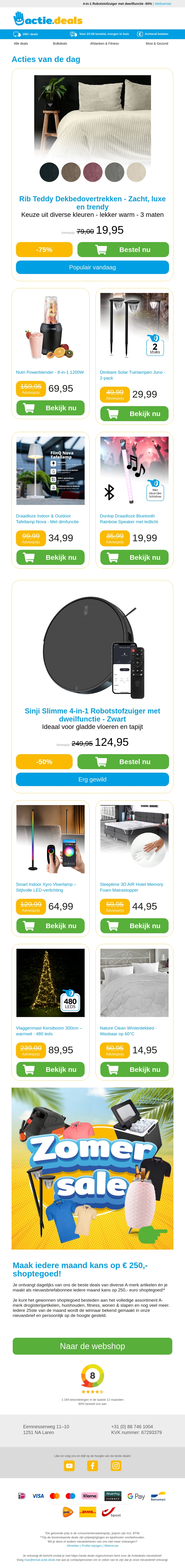 Grijp nu jouw kans met de nieuwste aanbiedingen! Van luxe Rib Teddy Dekbedovertrekken tot handige Power NutriBlenders en stijlvolle Solar Tuinlampen. Ontdek ook de veelzijdige Indoor & Outdoor Tafellamp en de kleurrijke Rainbow Speaker. Mis deze deals niet!