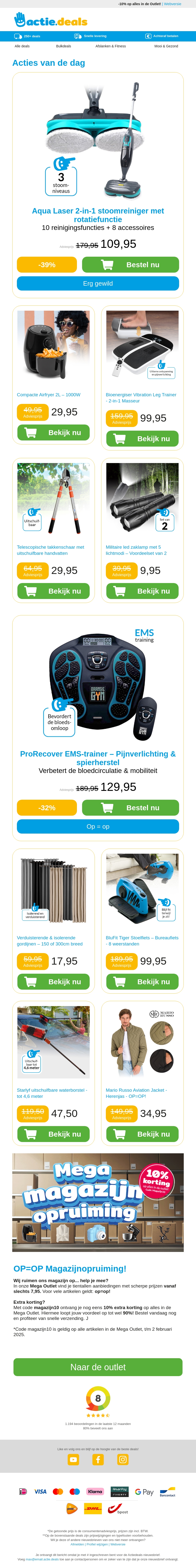 In deze nieuwsbrief vind je onweerstaanbare aanbiedingen, waaronder een roterende stoommop, mini airfryer, en een veelzijdige telescopische takkenschaar. Mis de kans niet om energiezuinige apparaten en handige tools te scoren. Of je nu op zoek bent naar een effectieve schoonmaakhulp of een compacte airfryer, hier vind je de beste deals. Bovendien kun je je spieren trainen met de innovatieve EMS-trainer. Zorg dat je snel bent, want op = op!