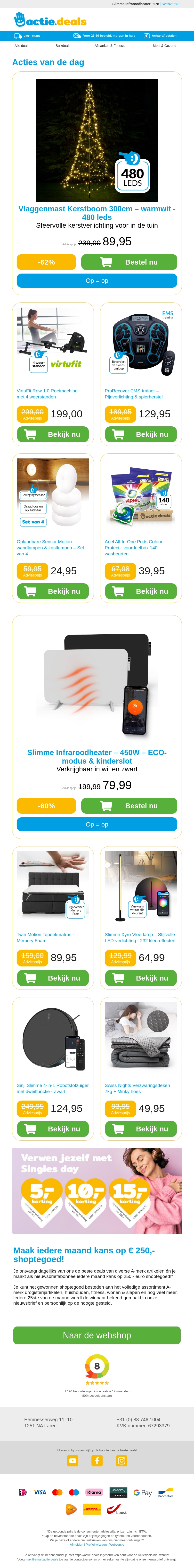 Singles Day kortingen! | Vlaggenmast kerstboom | Roeimachine | EMS-trainer | Sensorspots | Ariel Waspods