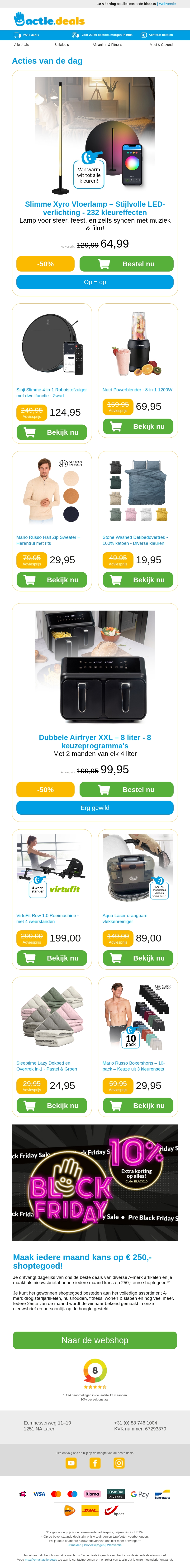 Ontdek de nieuwste aanbiedingen, waaronder de slimme LED vloerlamp met 232 kleureffecten, een robotstofzuiger met mopfunctie, en stijlvolle herentruien. Profiteer van de deals tijdens onze Pre Black Friday Sale met maar liefst 10% extra korting. Mis deze kans niet om je interieur en garderobe voordelig te vernieuwen. Bekijk nu ook ons assortiment katoenen dekbedovertrekken voor een luxe nachtrust. Koop slim in en bespaar groots!