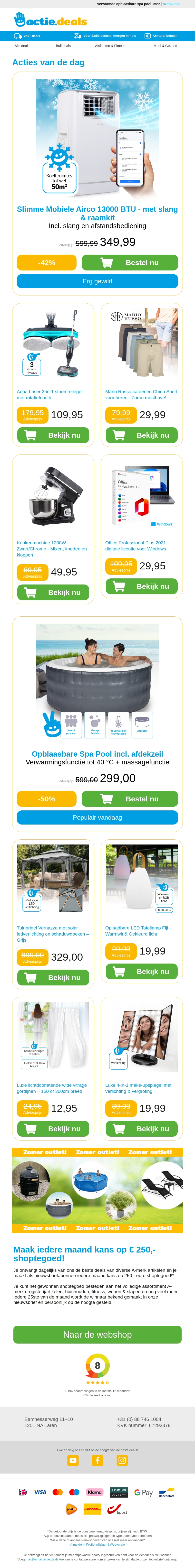 Bekijk onze nieuwste deals: Slimme Mobiele Airco 13000BTU, roterende stoommop, chino shorts, keukenmachine en Officelicentie Windows. Profiteer van kortingen tot 50% en blijf koel en comfortabel deze zomer. Bestel nu en bespaar!