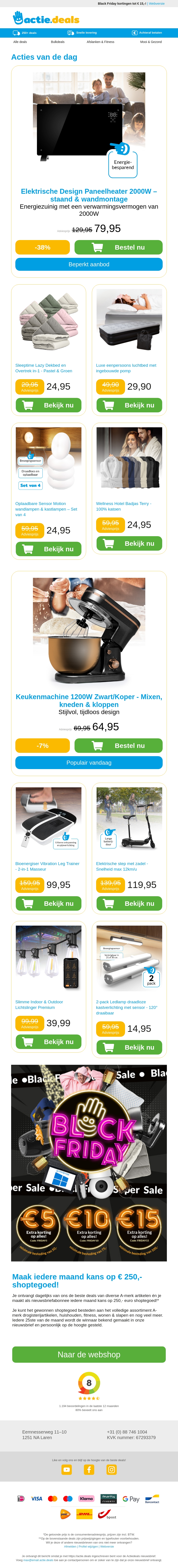 Profiteer van scherpe kortingen op diverse producten zoals de slimme paneelheater en het Lazy 2-in-1 dekbed. Ontdek luxe opties zoals luchtbedden en hotel badjassen. Mis ook de speciale Black Friday aanbiedingen niet voor extra besparingen.