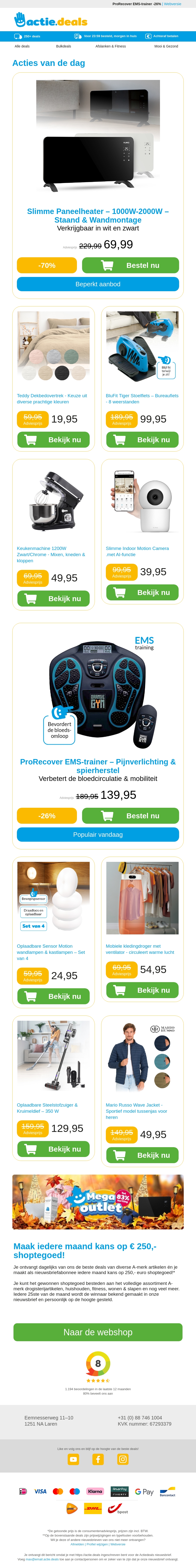 Bekijk onze geweldige aanbiedingen met kortingen op slimme paneelheaters en Teddy dekbedovertrekken. Ideaal voor het najaar! Ook in de aanbieding: BluFit stoelfiets, retro keukenmachines, en indoorcamera's. Zorg dat je niets mist van deze exclusieve deals. Bestel snel via onze webshop en profiteer van deze scherpe prijzen.