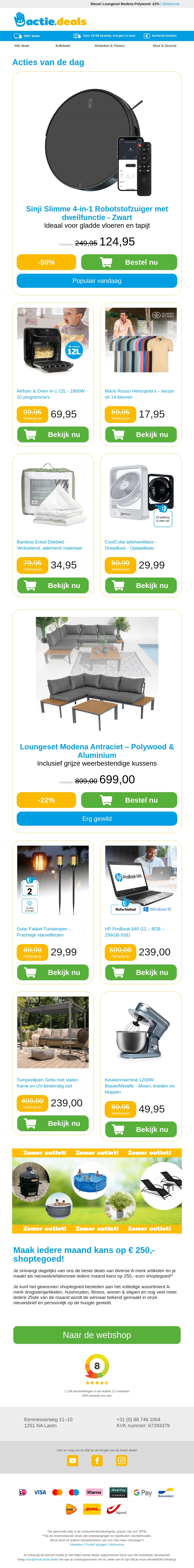 Ben je op zoek naar geweldige deals? Bekijk dan de nieuwste aanbiedingen zoals de Sinji slimme robotstofzuiger, de XXL airfryer, comfortabele katoenen herenpolo's, luxe bamboe dekbedden en nog veel meer. Mis het niet en bespaar vandaag nog met onze speciale kortingen!