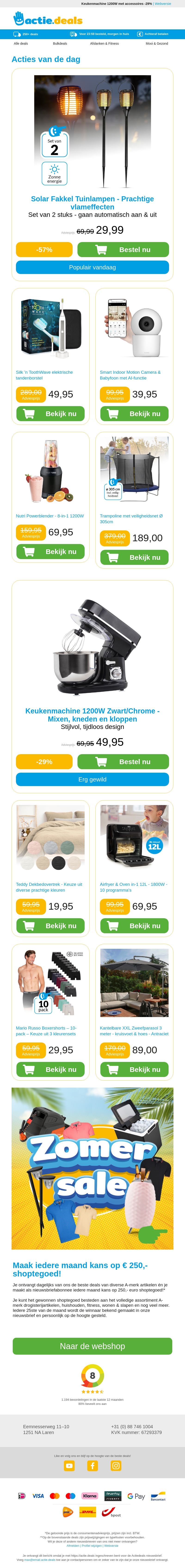 Bekijk de nieuwste aanbiedingen van de week! Onze Solar Fakkel Tuinlampen creΓ«ren prachtige vlam effecten voor uw tuin. Ontdek de kracht van de elektrische tandenborstel, houd uw huis veilig met de indoorcamera, en geniet van heerlijke smoothies met de Power NutriBlender. Mis ook de XXL Trampoline niet voor maximaal plezier!