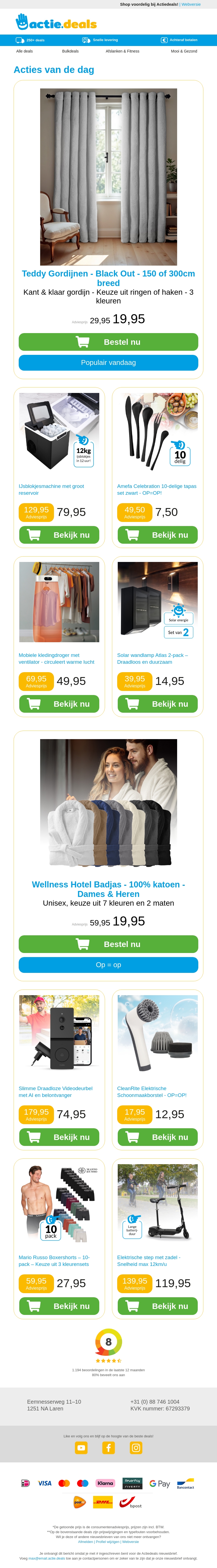 Mis niet de nieuwste deals bij actie.deals: Teddy gordijnen perfect voor elk interieur, een handige ijsblokjesmachine voor zomerse drankjes, en een complete tapas set voor heerlijke avonden. Voor huishoudelijke oplossingen bieden we een mobiele kledingdroger en stijlvolle solar tuinlampen. Alles nu beschikbaar tegen fantastische prijzen.