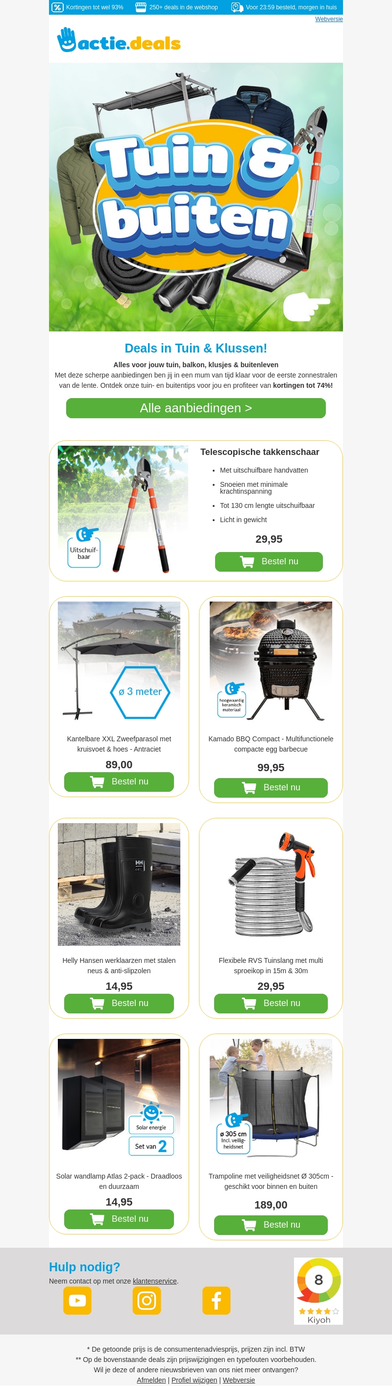 Geniet van geweldige kortingen tot 74% op een uitgebreid assortiment tuin- en buitenartikelen. Van telescopische takkenscharen tot handige barbecues en stijlvolle parasols: wij hebben alles wat je nodig hebt voor een perfecte zomersetting. Zorg dat je er op tijd bij bent en profiteer van deze unieke aanbiedingen!