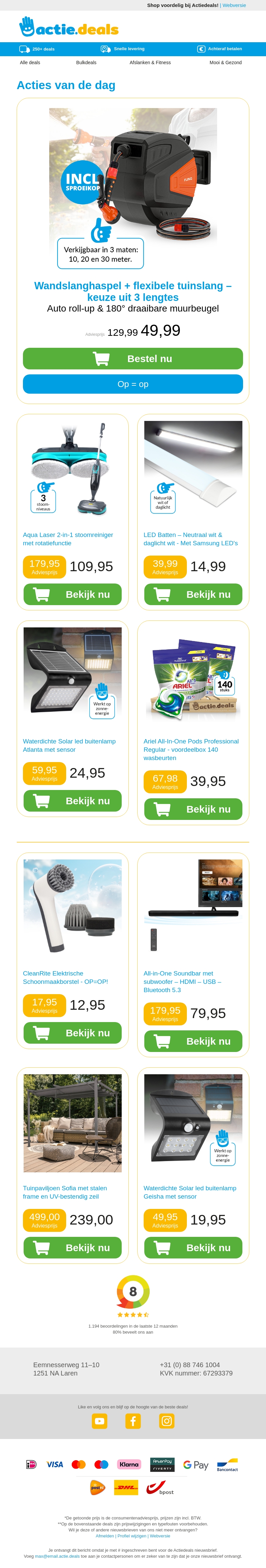 Wandslanghaspel + tuinslag | Stoomreiniger | LED Batten | Waterdichte Solar Lamp | Ariel All-In-One Pods 140 stuks