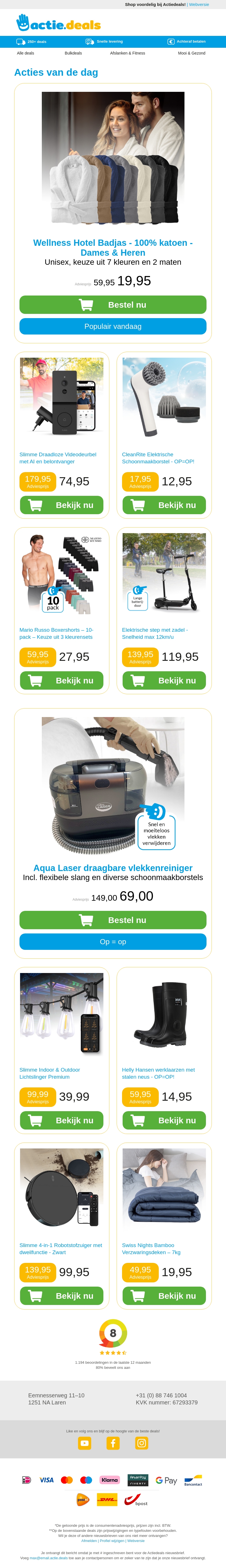 Mis de 'Acties van de dag' niet! Geniet van geweldige kortingen op de Wellness Hotel Badjas, draadloze videodeurbel, en nog veel meer. Perfect voor uw zelfzorgmomenten of om uw huis smart te maken. Profiteer nu van onze speciale prijzen.