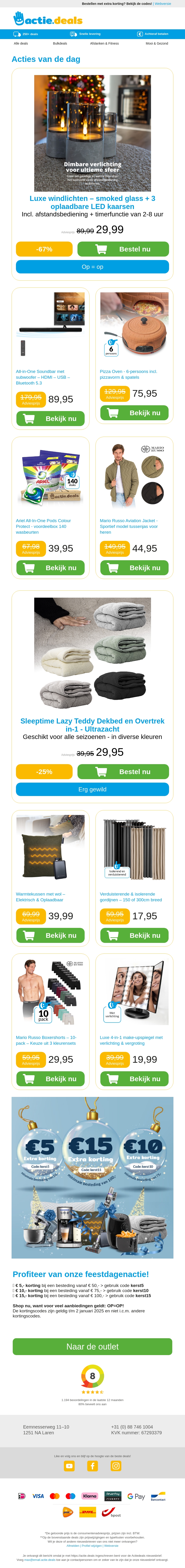 Duik in onze geweldige aanbiedingen met luxe windlichten en oplaadbare LED-kaarsen voor een gezellige sfeer. Verhoog je audio-ervaring met de bluetooth soundbar en subwoofer. Geniet van heerlijke pizza's met de nieuwste pizza oven en houd je was stralend schoon met Ariel Pods. Stijlvol de winter in met moderne herenjassen.