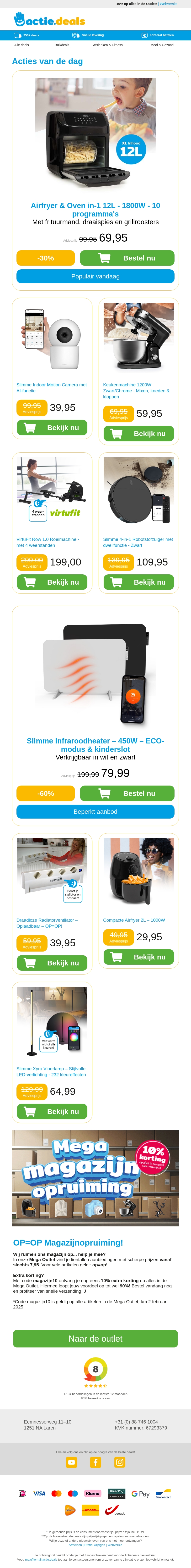 Duik in onze nieuwste deals met de XXL Airfryer 12L voor al je kookbehoeften. Ontdek ook de slimme indoorcamera, krachtige keukenmachine en geavanceerde robotstofzuiger. Profiteer nu van geweldige kortingen en upgrade je huis met de nieuwste technologie.