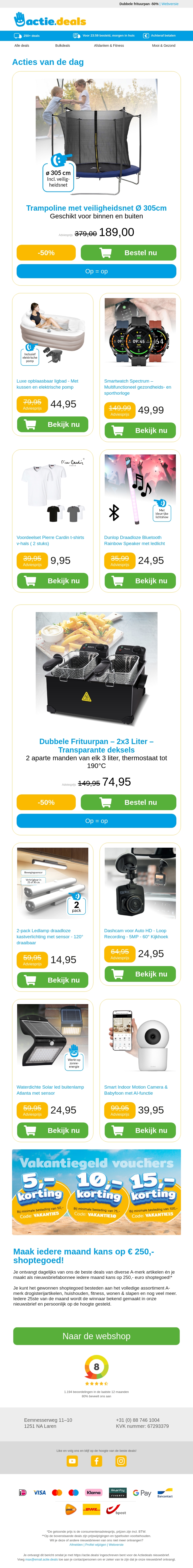 Bekijk deze fantastische deals! Een XXL trampoline met veiligheidsnet, een luxe opblaasbaar ligbad, een multifunctioneel smart- en sporthorloge, katoenen V-hals T-shirts van Pierre Cardin, en een draadloze Bluetooth partyspeaker. Wacht niet te lang, op = op!
