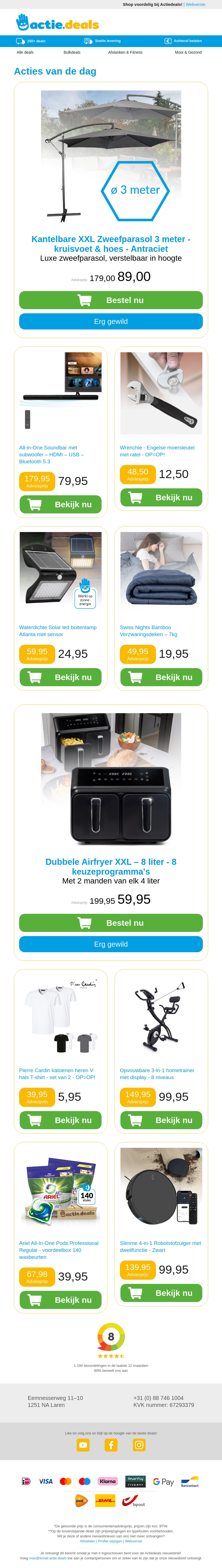Ontdek de geweldige aanbiedingen van vandaag met een indrukwekkende Zweefparasol XXL die perfect is voor elke tuin. Deze komt met een verstelbare hoogte en een moderne uitstraling. Verder vindt u een veelzijdige all-in-one Soundbar voor een onovertroffen audio-ervaring, en functionele gadgets zoals een handige moersleutel met ratel. Mis ook de kans niet op een comfortabele verzwaringsdeken die een heerlijke nachtrust garandeert.