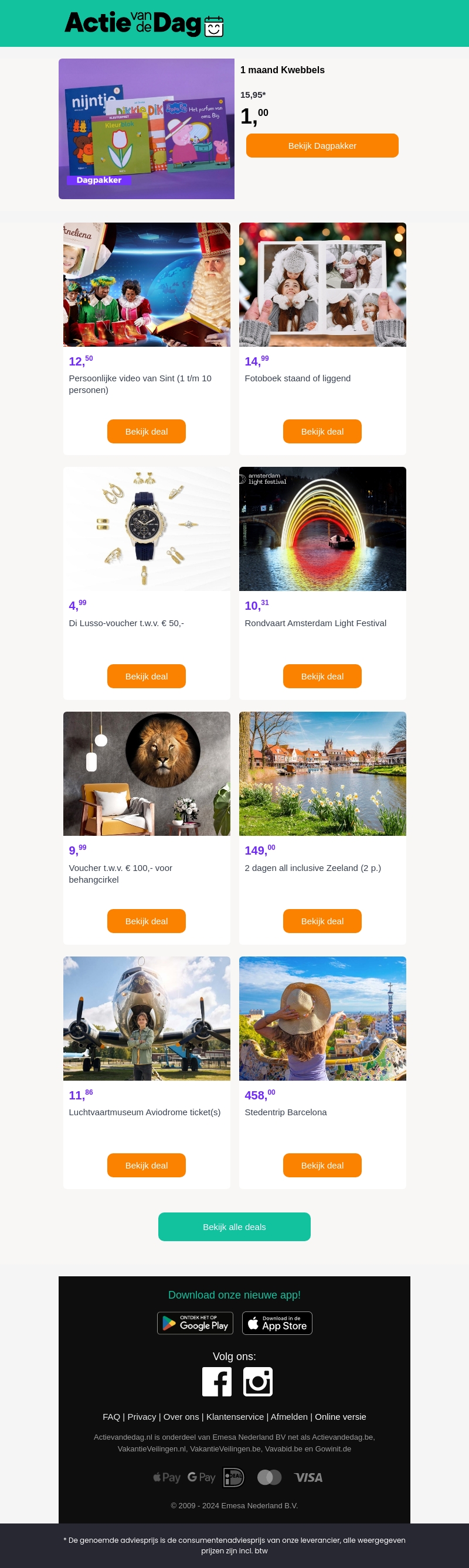 Ontdek aantrekkelijke aanbiedingen met Actie van de Dag. Vanaf nu geniet je van 1 maand Kwebbels voor slechts €1. Er zijn ook deals voor gepersonaliseerde video's van de Sint, fotoboeken, en meer. Mis de Amsterdam Light Festival rondvaart niet. Deze nieuwsbrief brengt je de beste kortingen!