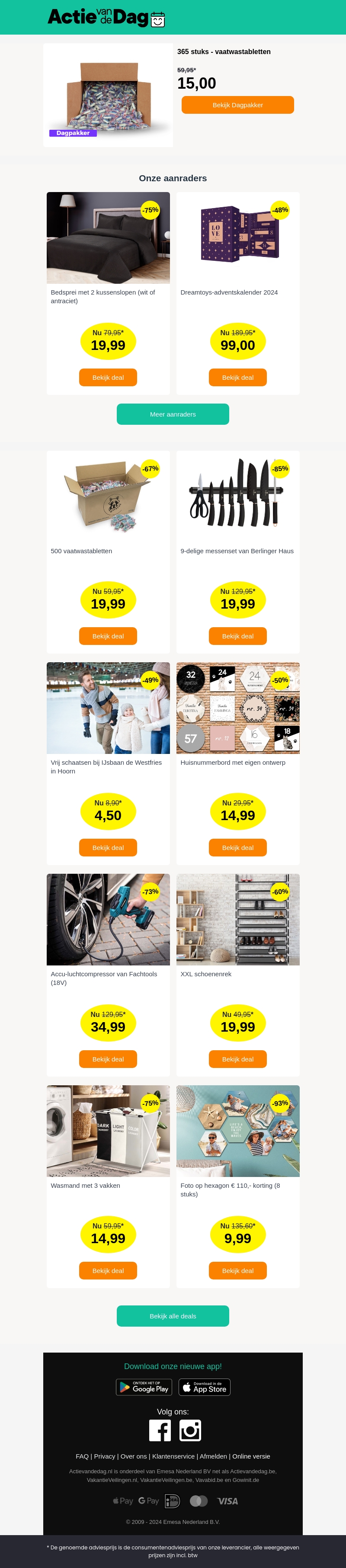 Profiteer van deze unieke aanbieding van 365 vaatwastabletten voor maar €15, een flinke besparing ten opzichte van de normale prijs. Deze deal is ideaal voor huishoudens die hun schoonmaakkosten willen verminderen. Plus, bekijk onze aanbevolen producten zoals bedsets en adventskalenders. Mis deze kans niet!
