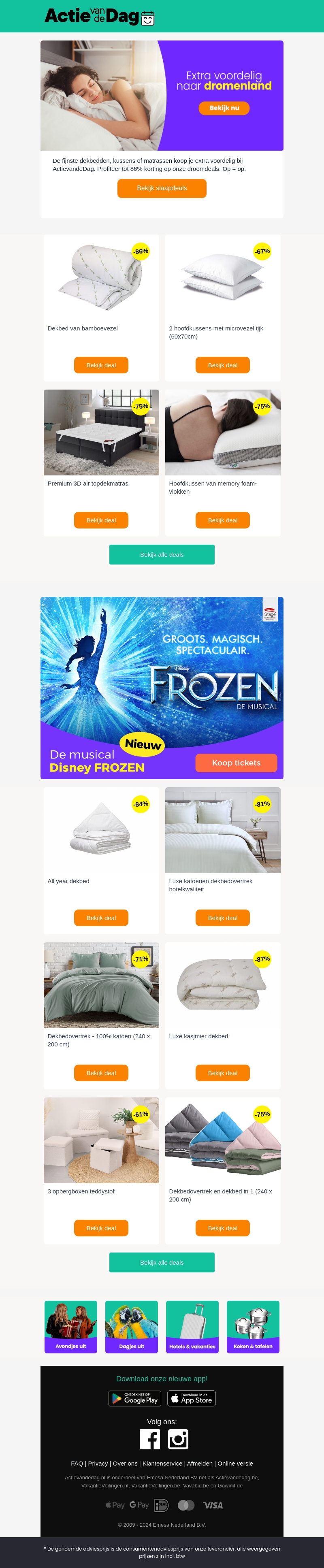 Deze nieuwsbrief van Actie van de Dag biedt geweldige kortingen op een breed scala aan beddengoed. Profiteer van kortingen tot wel 86% op dekbedden, kussens en matrassen. Zorg ervoor dat je snel bent, want de deal geldt zolang de voorraad strekt. Mis niet de kans om jouw slaapkamer aan te vullen met kwalitatief hoogwaardig beddengoed tegen een fractie van de prijs. Ontdek nu meer en bespaar.