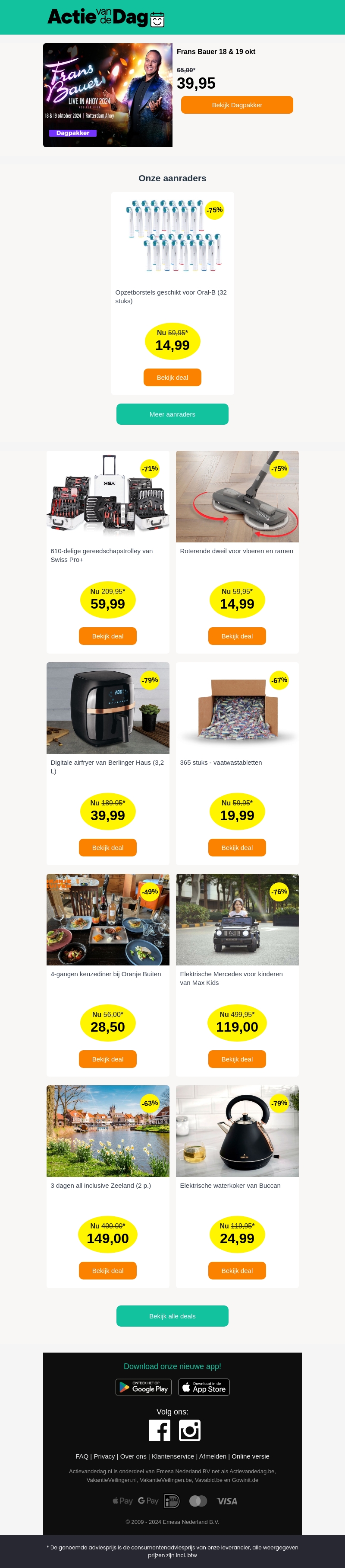 Ontdek het concertaanbod van Frans Bauer op 18 en 19 oktober voor slechts €39,95. Daarnaast biedt Actie van de Dag diverse exclusieve aanbiedingen zoals elektrische kindervoertuigen, luxe dineravonden en meer. Zorg dat je niets mist van deze geweldige deals. Van slimme huishoudelijke apparaten tot gezinsuitjes, er is voor ieder wat wils. Grijp je kans en profiteer van hoge kortingen. Bekijk nu snel alle aanbiedingen!