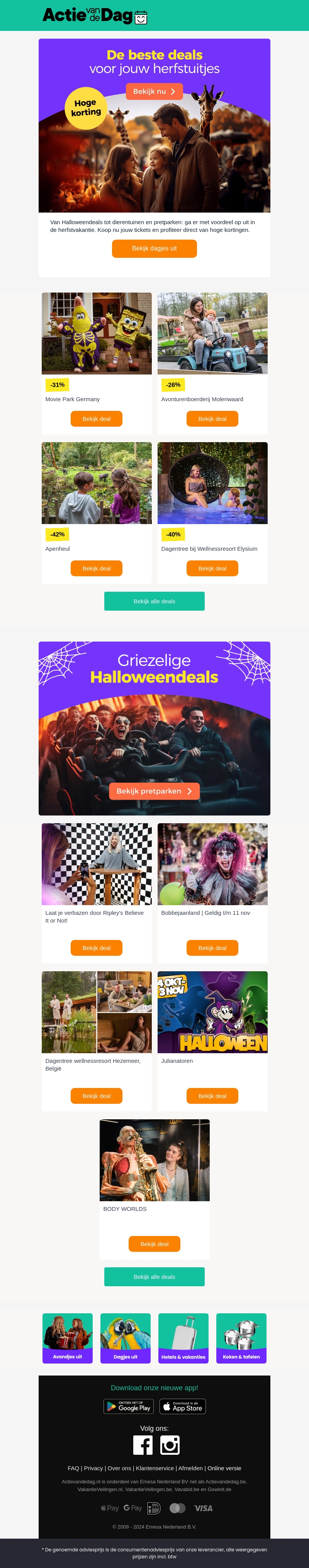 Profiteer deze herfstvakantie van geweldige deals met hoge kortingen. Ontdek aanbiedingen voor dierentuinen en pretparken, ideaal voor een gezellig uitje met het gezin. Van griezelige Halloweendeals tot ontspannende wellness ervaringen, er is voor ieder wat wils. Bekijk de aanbiedingen nu en plan je perfecte uitje.