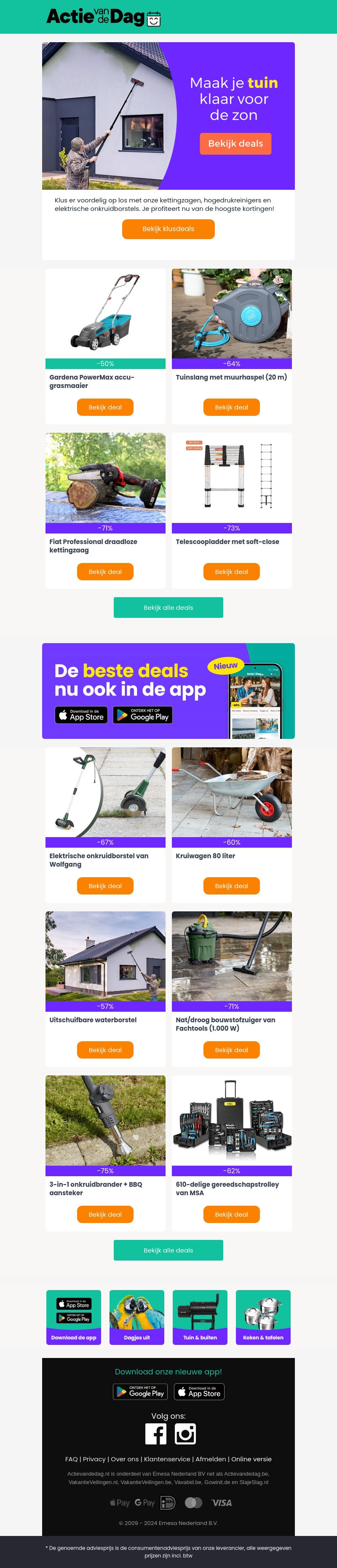 Bereid je tuin voor op de zomer met de beste deals van Actie van de Dag. Ontvang aanzienlijke kortingen op kettingzagen, hogedrukreinigers, en elektrische onkruidborstels. Mis deze unieke aanbiedingen niet en maak je klus af voor een fractie van de prijs!