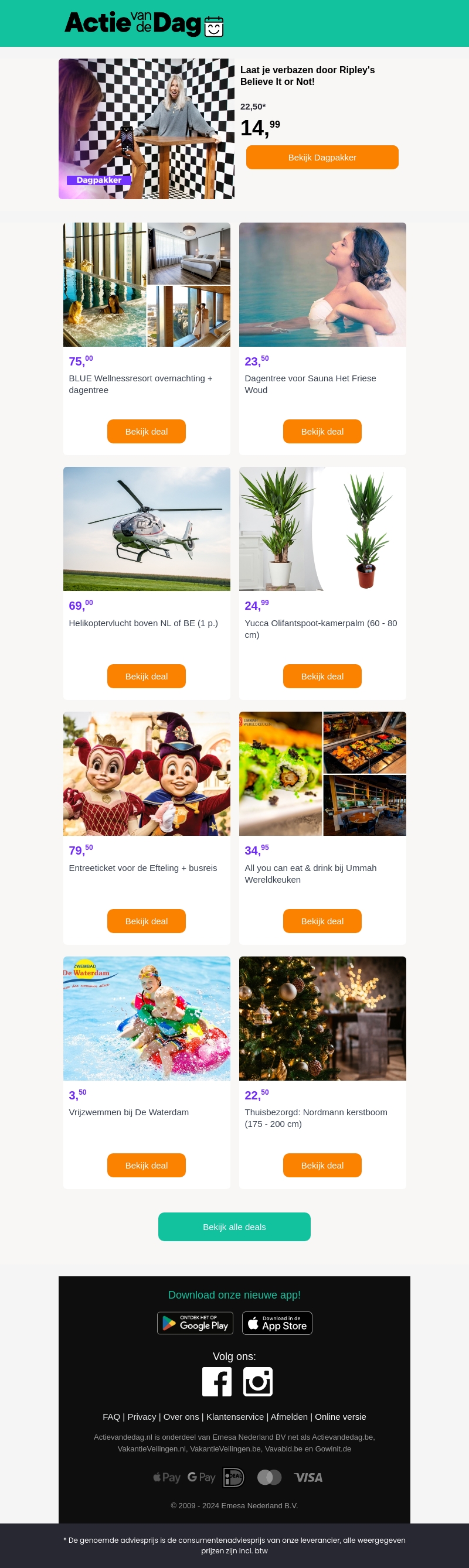 Deze week presenteren wij een reeks boeiende deals. Ontdek Ripley's Believe It or Not! met een geweldige korting, geniet van wellness in een luxe resort, of beleef een avontuurlijke helikoptervlucht. Daarnaast zijn er deals voor de Efteling, een smakelijk buffet bij een wereldkeuken, en prachtige kerstbomen aan huis bezorgd.