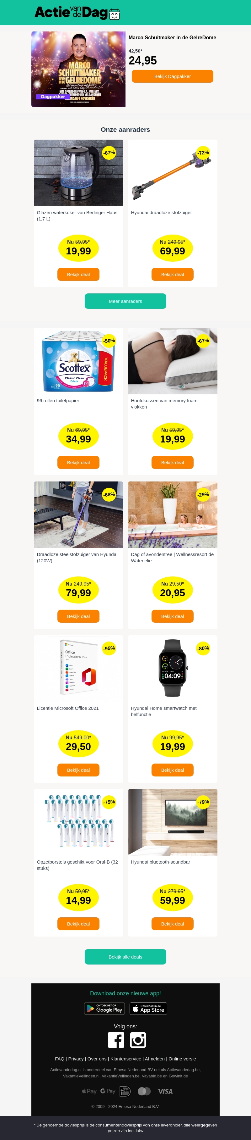 Ontmoet Marco Schuitmaker live in de GelreDome met tickets vanaf slechts €24,95. Bekijk onze aanbevolen producten met enorme kortingen, inclusief een glazen waterkoker en een draadloze stofzuiger. Bespaar tot 95% op Microsoft Office 2021 en geniet van wellnessdeals. Ontvang het laatste nieuws en aanbiedingen nu!