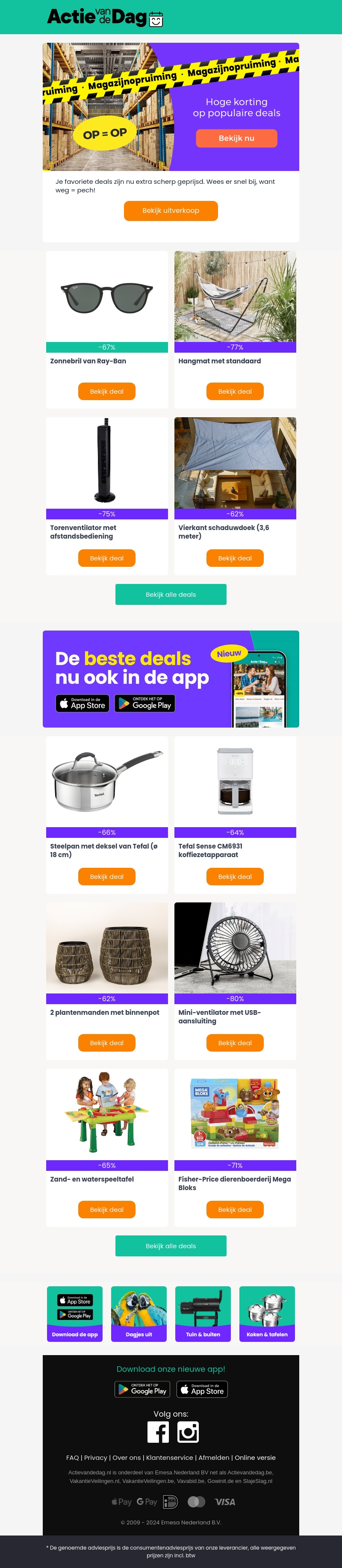 Profiteer van de magazijnuitverkoop met hoge kortingen op diverse populaire items. Van zonnebrillen tot ventilatoren, er is voor ieder wat wils. Wees er snel bij, want op=op!