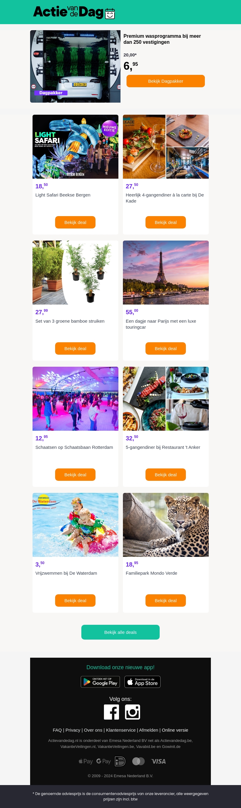 Beleef de ultieme verzorging voor uw auto met ons premium wasprogramma, nu beschikbaar op meer dan 250 locaties voor maar €6,95. Ontdek daarnaast fantastische deals zoals een Light Safari, gastronomische diners, een dagje Parijs, en meer! Ontdek de mogelijkheden voor een verrassende en voordelige ervaring.