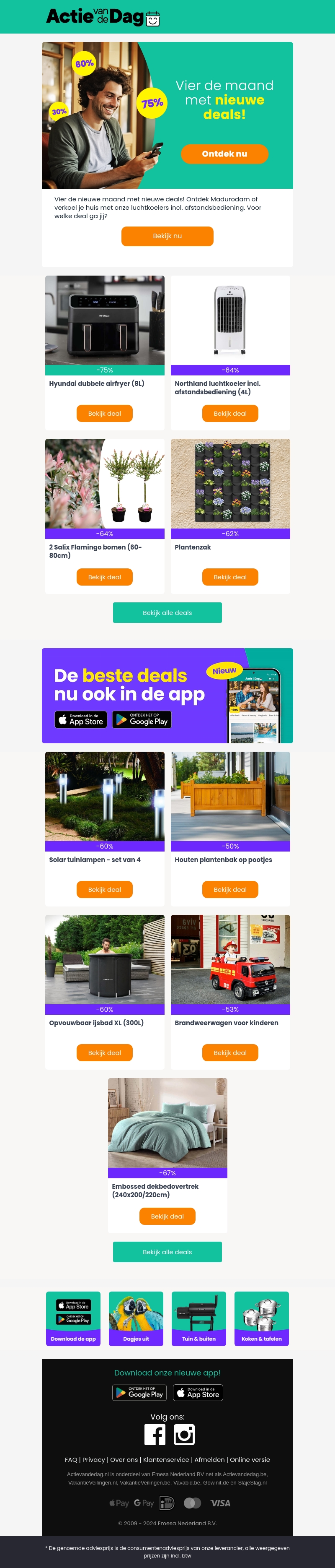 Vier de maand met spectaculaire kortingen tot 75%! Ontdek de Hyundai dubbele airfryer, Northland luchtkoeler en andere geweldige producten. Bekijk de deals nu en bespaar groots op je favoriete items.