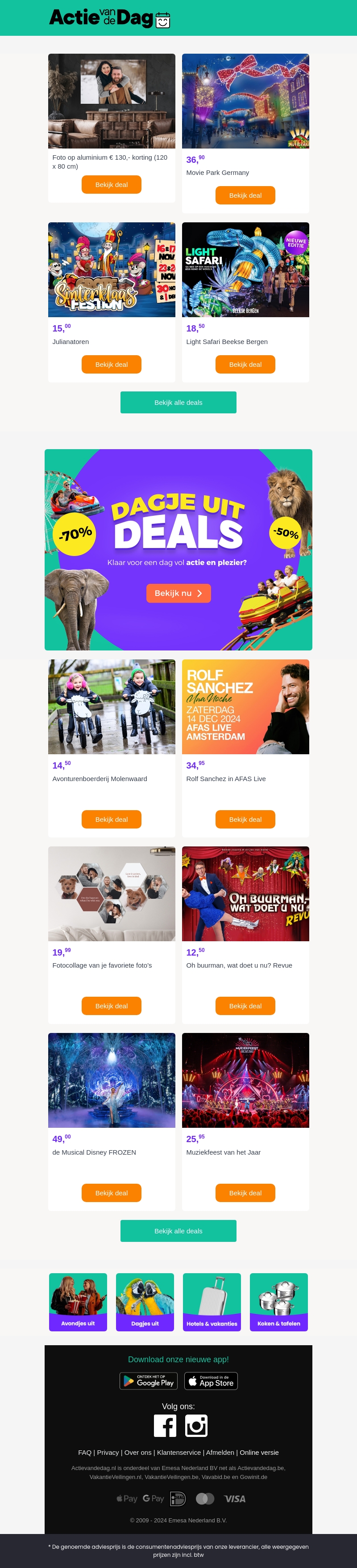 In deze nieuwsbrief hebben we speciaal voor jou onze top 10-deals verzameld. Van heerlijk dagjes uit tot avontuurlijke vakanties, er is voor ieder wat wils. Geniet van kortingen tot wel 70% en ontdek geweldige aanbiedingen voor jouw favoriete merken. Mis geen enkele kans en bekijk snel de deals. Of je nu houdt van ontspanning of spanning, er is een perfecte deal voor jou. Meld je aan en profiteer van de beste kortingen!