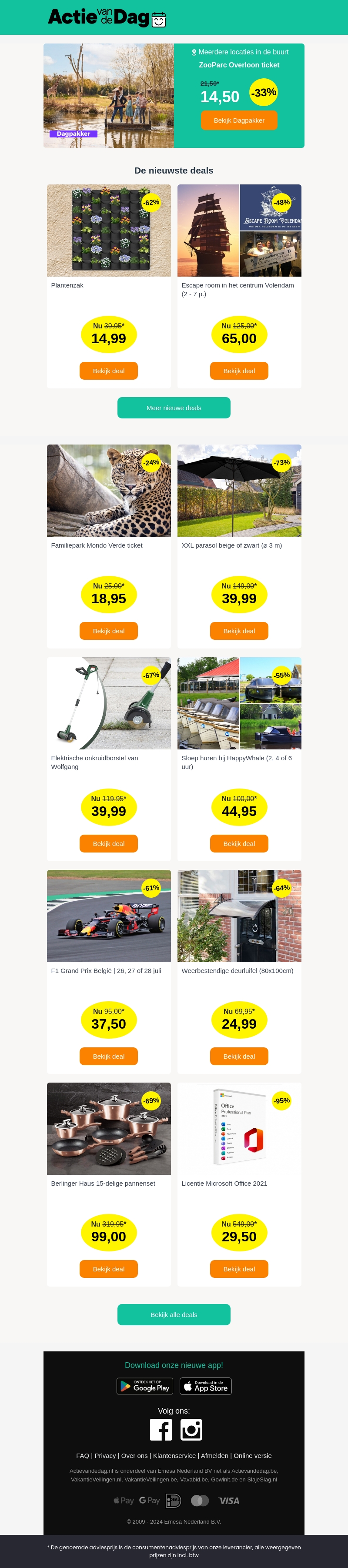 Actie van de Dag brengt je de nieuwste deals met ongelooflijke kortingen. Van ZooParc Overloon tickets tot aan Berlinger Haus pannensets, er is voor ieder wat wils. Houd je van avontuur? Ontsnap dan aan een escape roomervaring of bezoek Familiepark Mondo Verde. Mis deze geweldige deals niet en bespaar vandaag nog!