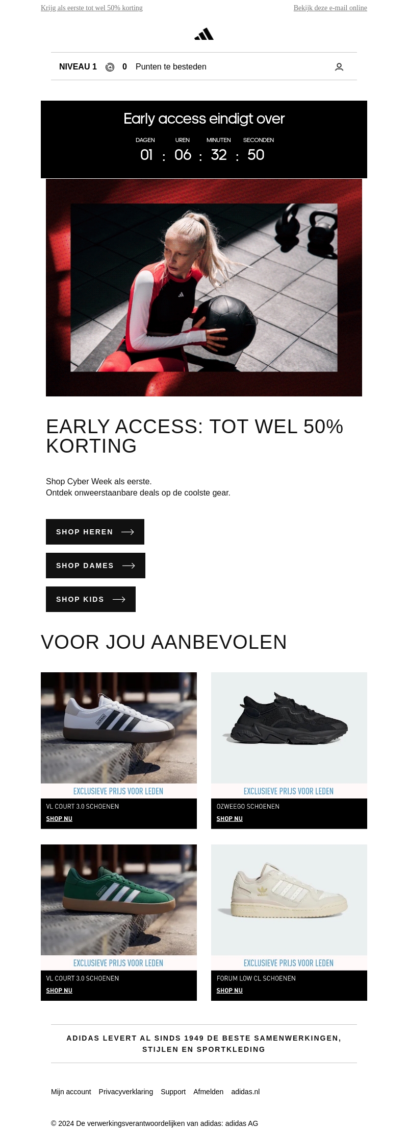adiClub-leden hebben als eerste toegang tot Cyber Week met kortingen tot wel 50%. Ontdek onweerstaanbare deals op de nieuwste sportkleding en gear. Profiteer van exclusieve prijzen en shop je favoriete items voordat ze uitverkocht zijn. Deze aanbieding geldt voor heren, dames en kinderen. Haast je, want de vroegtijdige toegang is slechts tijdelijk beschikbaar.
