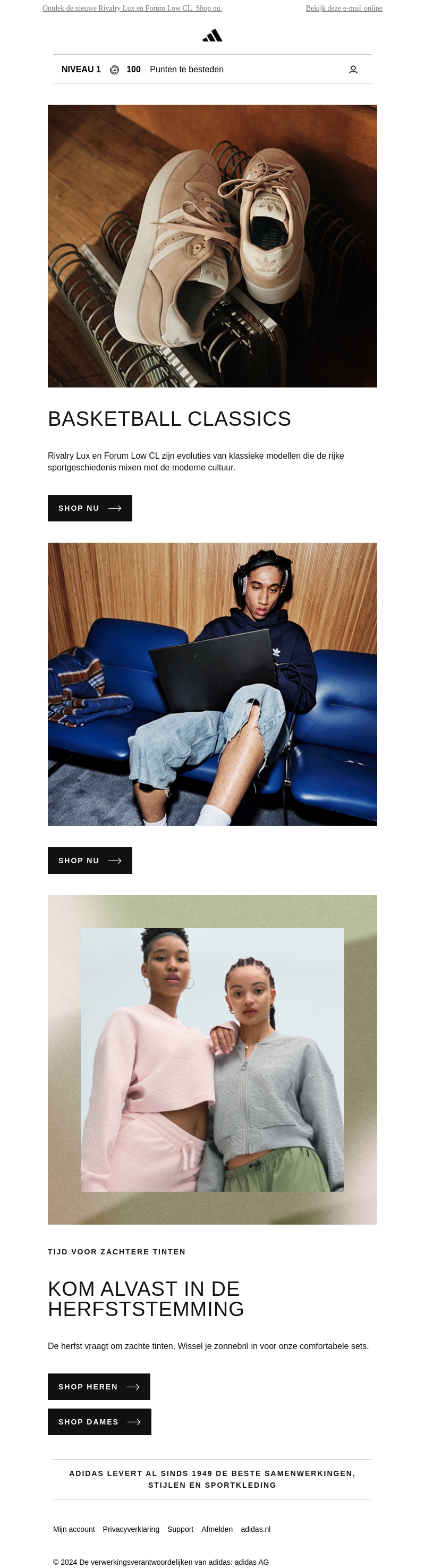 De Adidas nieuwsbrief presenteert de nieuwe Rivalry Lux en Forum Low CL. Deze modellen combineren de rijke sportgeschiedenis met moderne cultuur. Ontdek ook comfortabele sets voor het herfstseizoen met zachte tinten. Shop nu en blijf stijlvol met Adidas.