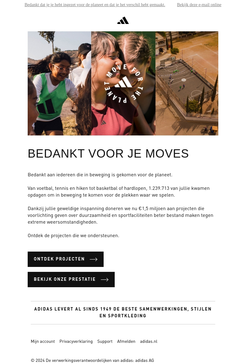 Bedankt aan iedereen die in beweging is gekomen voor de planeet. Dankzij jullie geweldige inspanning doneren we nu €1,5 miljoen aan projecten die voorlichting geven over duurzaamheid en sportfaciliteiten beter bestand maken tegen extreme weersomstandigheden.