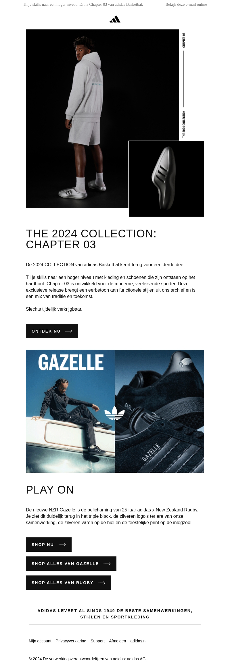 De 2024 COLLECTION van adidas Basketbal keert terug voor een derde deel. Til je skills naar een hoger niveau met kleding en schoenen die zijn ontstaan op het hardhout. Chapter 03 is ontwikkeld voor de moderne, veeleisende sporter. Slechts tijdelijk verkrijgbaar.