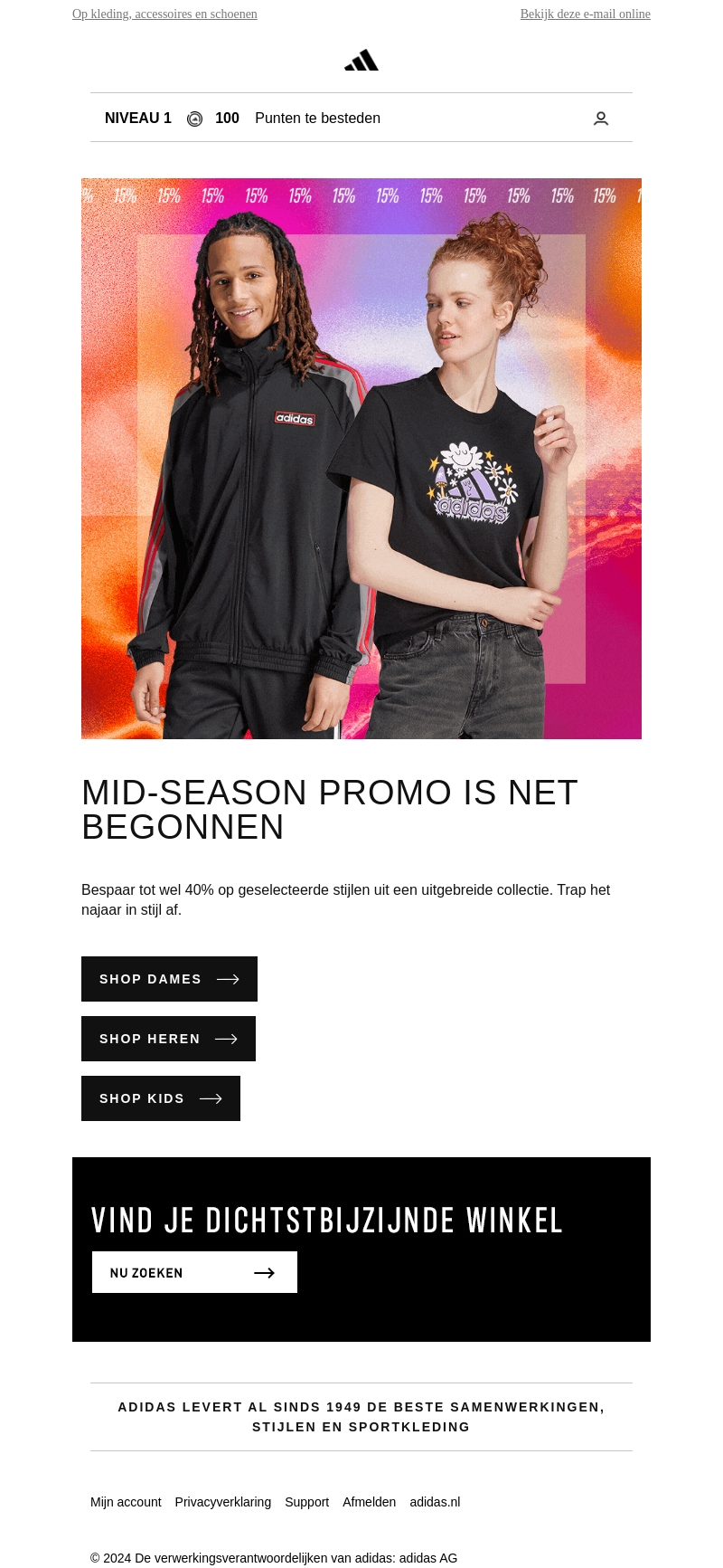 De mid-season promotie is begonnen! Ontdek tot wel 40% korting op een uitgebreide collectie van stijlvolle items. Zowel voor dames, heren als kinderen zijn er fantastische aanbiedingen te vinden. Bezoek de dichtstbijzijnde winkel of winkel online om deze deals niet te missen. Zorg ervoor dat je het najaar begint met de beste stijlen. Geniet van mode en sportkleding van topkwaliteit.