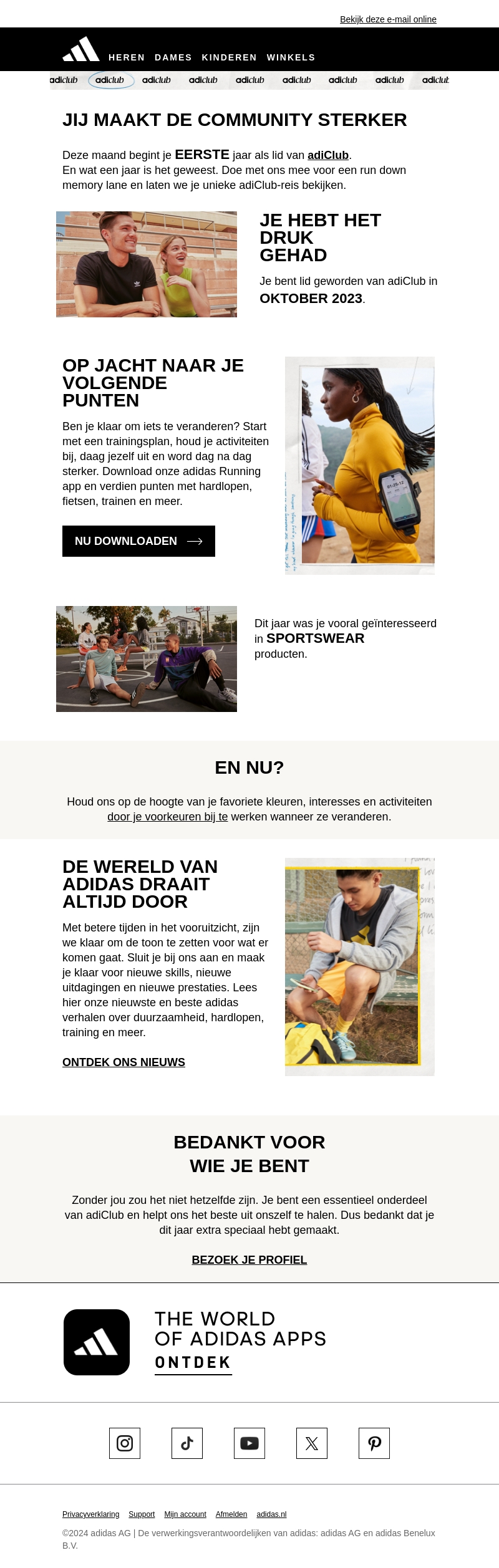 Deze maand vier je je eerste jaar als lid van adiClub! We nodigen je uit op een reis door herinneringen. Verander je routine met onze adidas Running app en verdien punten. Blijf op de hoogte van nieuwe skills en uitdagingen in de wereld van adidas. Bedankt voor je lidmaatschap en voortdurende steun aan de community!