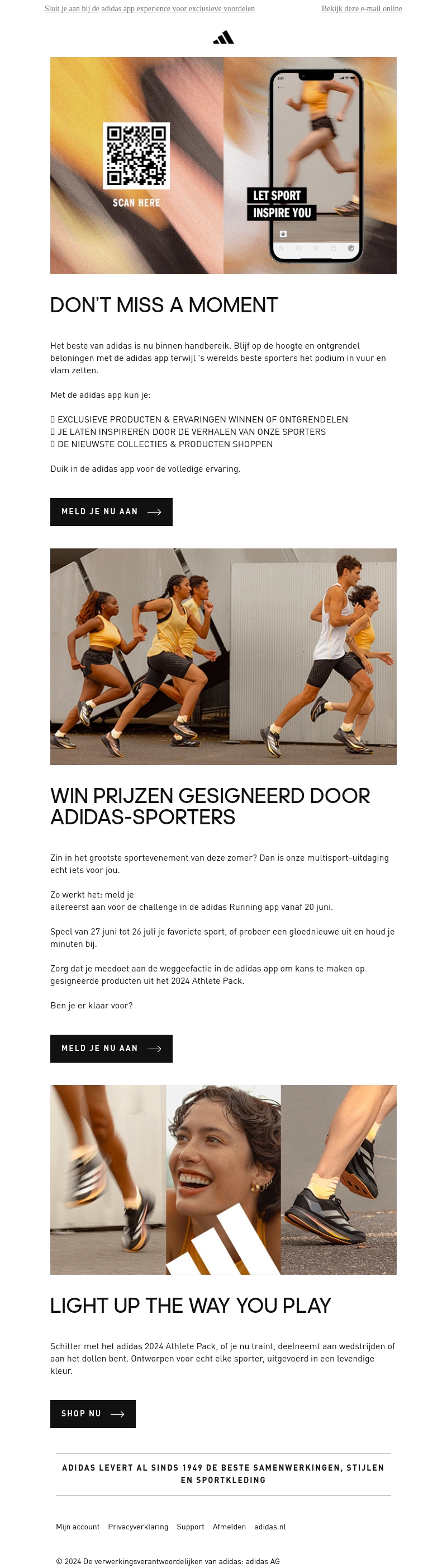 Blijf op de hoogte van het grootste sportevenement van deze zomer met de adidas app. Ontvang exclusieve beloningen, laat je inspireren door topatleten en shop de nieuwste collecties. Doe mee aan de multisport-uitdaging en win gesigneerde prijzen van adidas-sporters. Ontdek nu de adidas 2024 Athlete Pack en verbeter je sportprestaties.