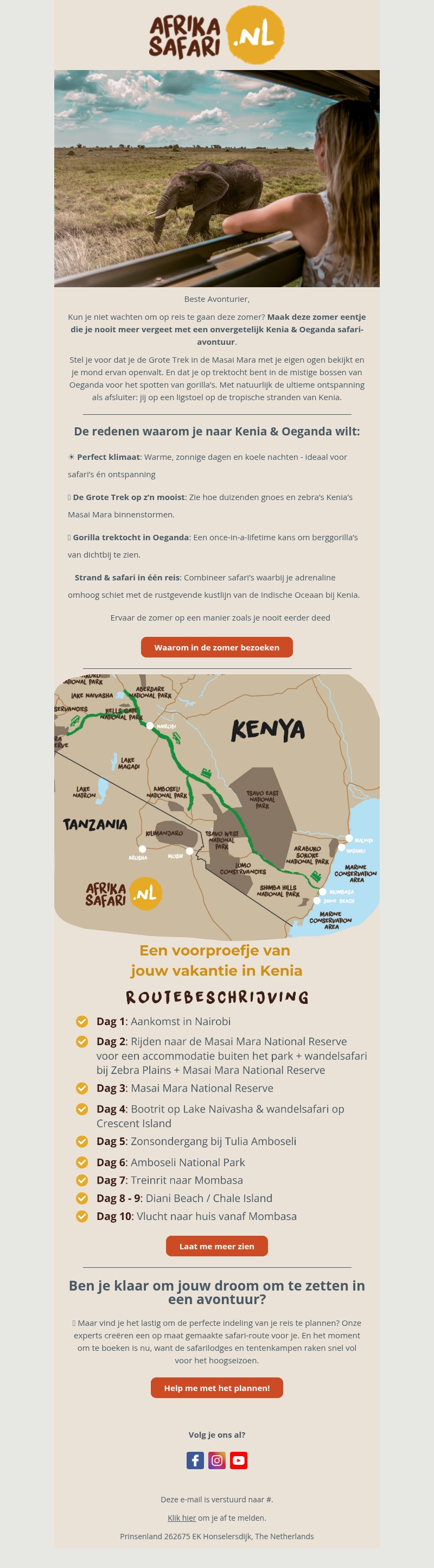 Maak deze zomer onvergetelijk met een safari-avontuur in Kenia en Oeganda. Ontdek de Grote Trek in de Masai Mara en trotseer de bossen in Oeganda voor gorilla's. Geniet van de tropische stranden van Kenia om je reis perfect af te sluiten. Combineer avontuur en ontspanning en beleef de zomer zoals nooit tevoren.