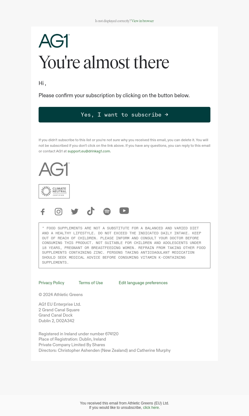 Hallo! Bevestig je AG1-abonnement door op de onderstaande knop te klikken. Zo blijf je op de hoogte van de nieuwste producten en aanbiedingen van AG1. Mis deze kans niet om deel uit te maken van onze community. Klik nu om te abonneren!