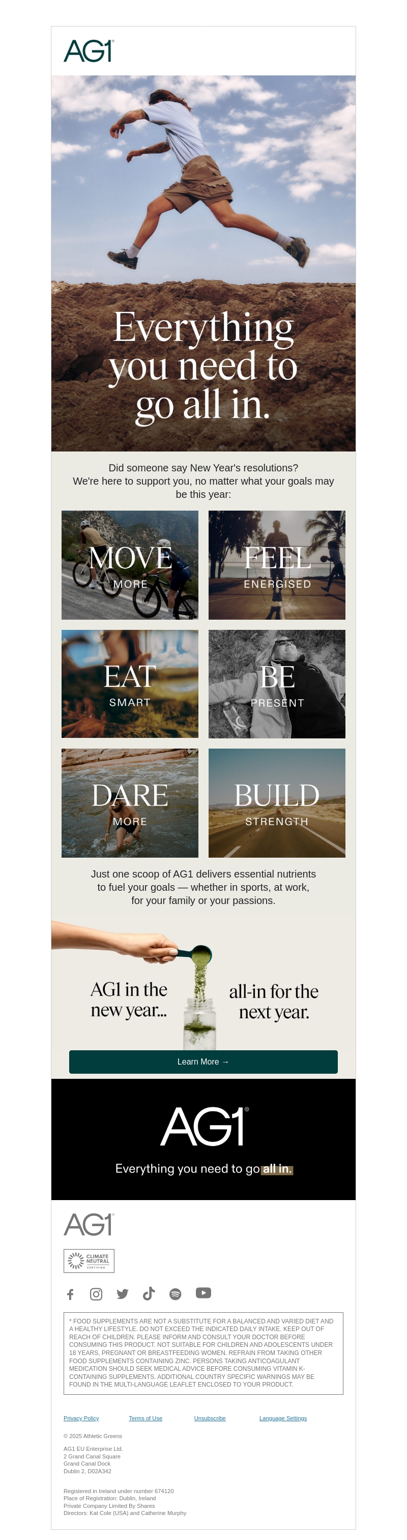 Ontdek de kracht van AG1 om je nieuwjaarsresoluties waar te maken. Of je nu meer wilt bewegen, energiek wilt voelen, slim wilt eten, aanwezig wilt zijn, meer lef wilt tonen of je kracht wilt opbouwen, AG1 biedt de essentiële voedingsstoffen die je nodig hebt. Begin het nieuwe jaar goed en ga ervoor met AG1.