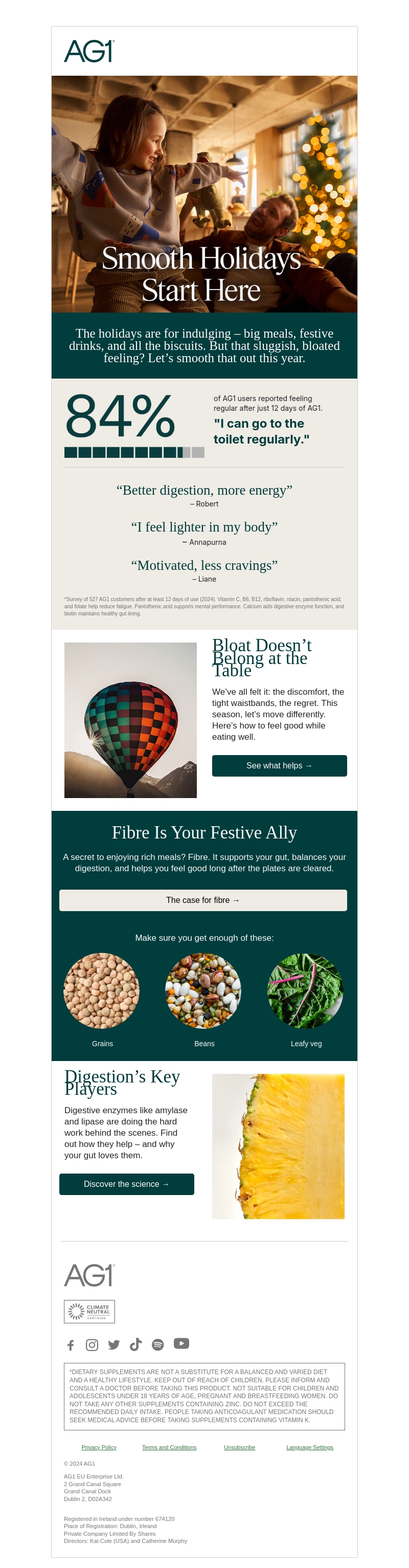 Deze nieuwsbrief staat in het teken van een zorgeloze feestperiode met AG1. Ervaar betere spijsvertering en meer energie tijdens de feestdagen. Ontdek hoe vezels en spijsverteringsenzymen je kunnen helpen om je gezond te voelen na uitgebreide maaltijden. Lees meer over AG1-gebruikers die positieve veranderingen ervaren. Bereid je voor op een gezonde en plezierige feestperiode.
