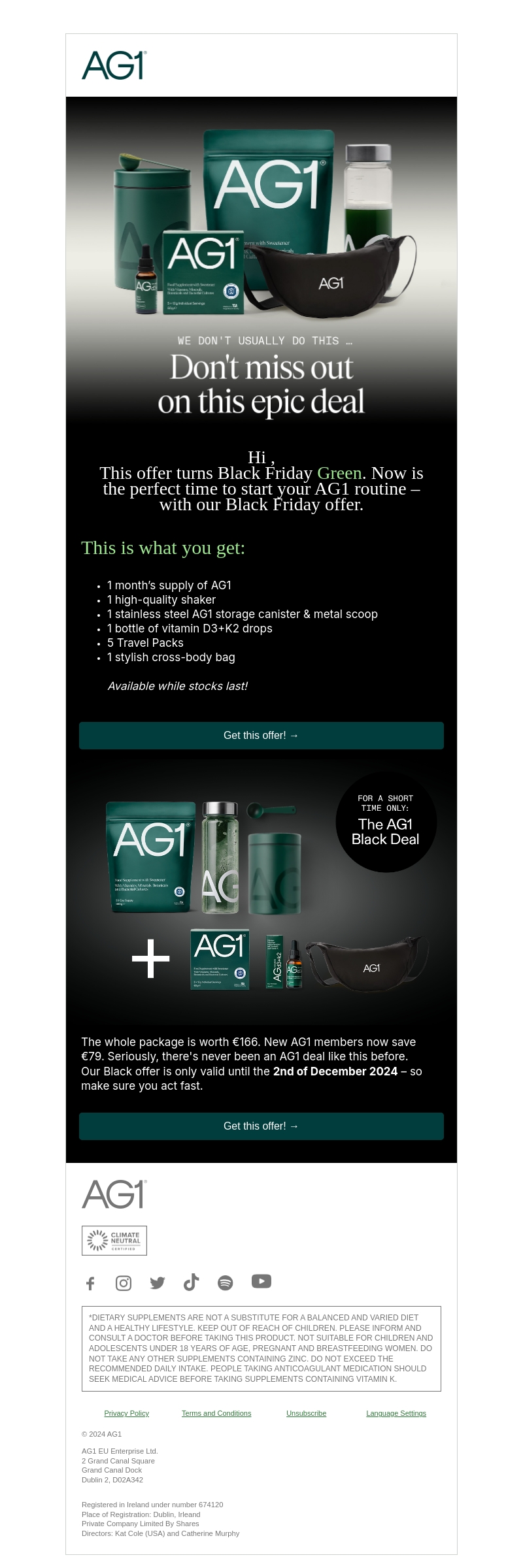 Pak deze unieke kans met de AG1 Black Friday Deal. Geniet nu van een maandvoorraad AG1 en diverse cadeaus voor slechts β¬79. Deze aanbieding is slechts geldig tot 2 december 2024, dus wees er snel bij.