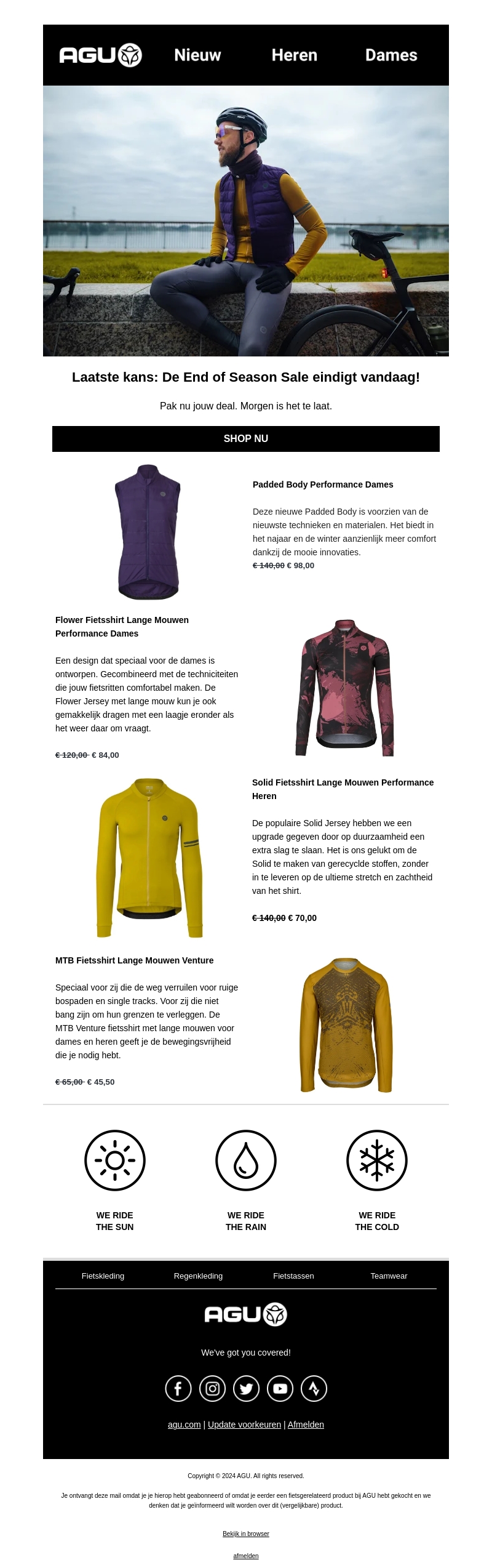 Vandaag is de laatste kans om te profiteren van de End of Season Sale bij AGU. Ontdek onze hoogwaardige fietskleding met flinke kortingen. Van performance jassen tot comfortabele fietsshirts, er is voor ieder wat wils. Zorg dat je jouw favoriete items bemachtigt voordat het te laat is. Perfect voor fietsers die op zoek zijn naar kwaliteit en stijl. Shop nu en mis deze deals niet!