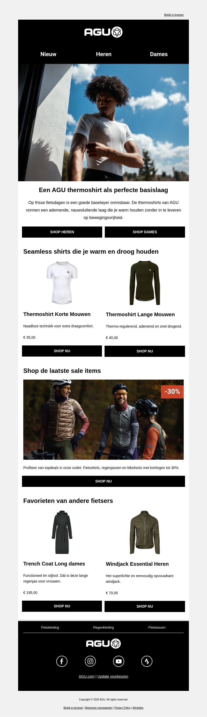 Beleef de ultieme fietservaring met de nieuwste collectie van AGU, nu met kortingen tot 30%. Van thermoshirts tot regenjassen, ervaar comfort en functionaliteit. Ontdek onze aanbiedingen voor zowel heren als dames en mis de topdeals niet. Upgrade je fietsoutfit en geniet van de beste kwaliteit.
