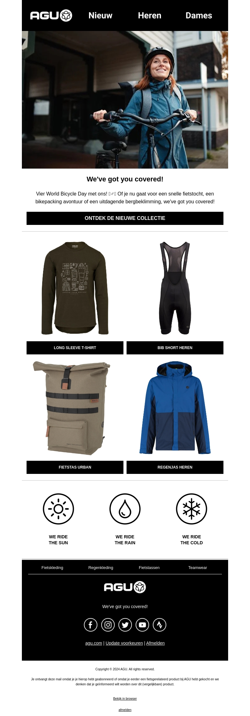 Vier World Bicycle Day met AGU! Of je nu een snelle fietstocht plant, een bikepacking avontuur beleeft of een uitdagende bergbeklimming onderneemt, AGU heeft alles wat je nodig hebt. Ontdek de nieuwste collectie fietskleding en accessoires voor elk seizoen en type fietser.