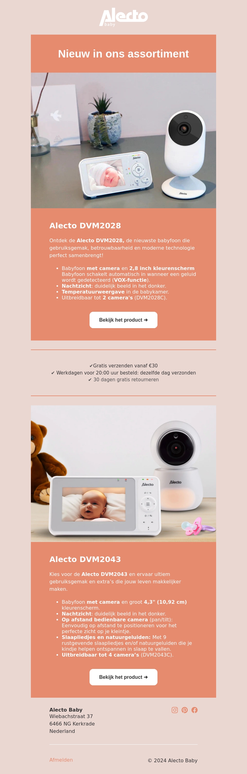 De nieuwste Alecto babyfoons, DVM2028 en DVM2043, bieden moderne technologieën om je kleintje in de gaten te houden. De DVM2028 heeft een 2,8 inch kleurenscherm en de DVM2043 heeft een groot 4,3 inch scherm. Beiden bieden nachtzicht, temperatuurwaarneming en uitbreidingmogelijkheden. Gratis verzending vanaf €30.
