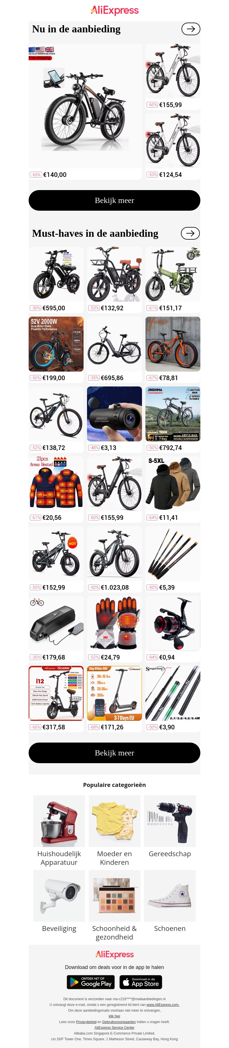 Profiteer van hoge kortingen tot 65% op diverse producten zoals krachtige 2000W elektrische fietsen. Deze fietsen zijn perfect voor off-road avonturen en bieden ultieme prestaties. In de aanbieding zijn ook andere must-have items zoals gereedschap en kleding. Mis deze kans niet om te besparen op topkwaliteit producten. Bekijk het volledige aanbod op AliExpress.