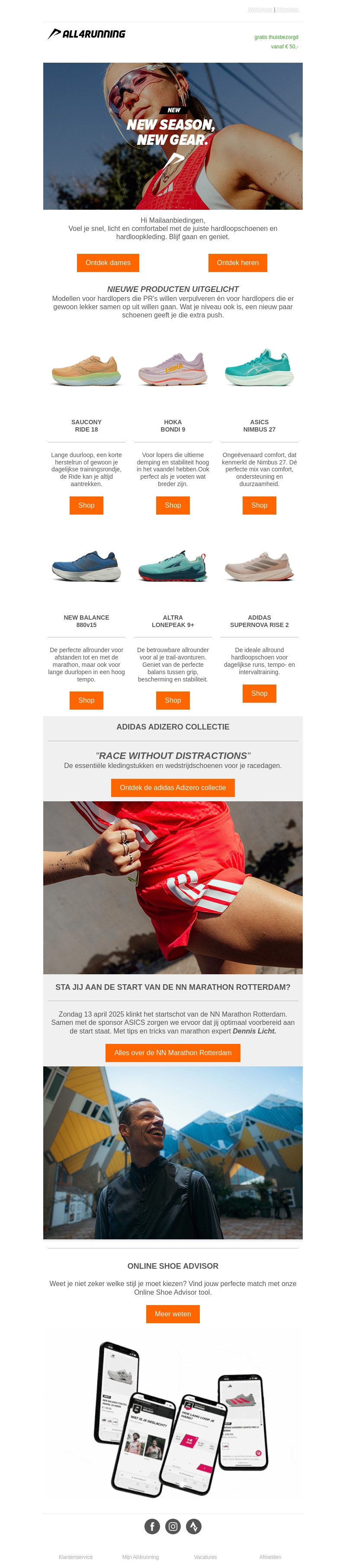 Verwelkom het nieuwe seizoen met onze speciaal geselecteerde hardloopschoenen en kleding. Onze collectie biedt de perfecte balans tussen comfort, stijl en prestatie. Of je nu een marathonloper bent of gewoon geniet van een dagelijkse run, we hebben iets voor jou. Bekijk onze nieuwste producten en bereid je optimaal voor op de NN Marathon Rotterdam. Gebruik onze Online Shoe Advisor voor een perfecte match.